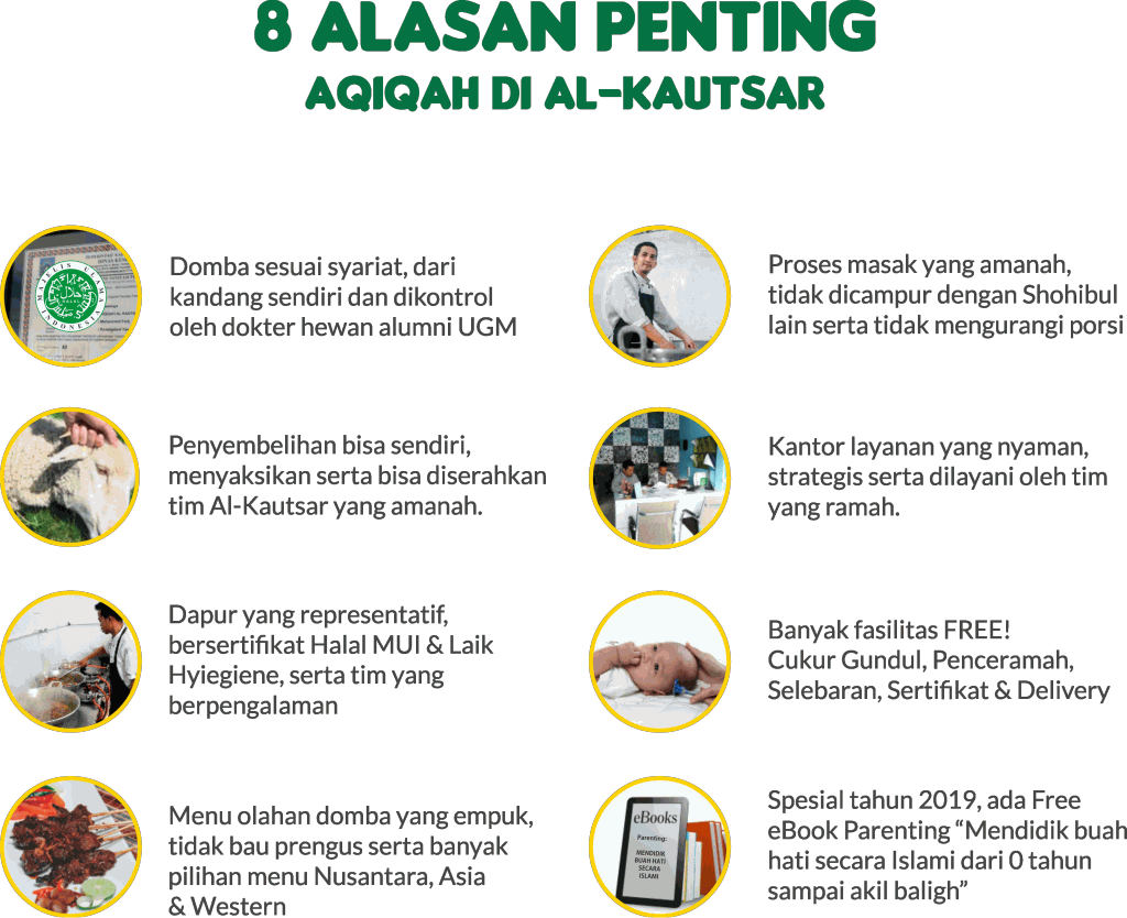 Aqiqah AlKautsar hadir guna memberi kemudahan dalam beribadah aqiqah. Anda tidak perlu repot mencari domba atau kambing, tidak perlu repot memasak dan mengemasnya. Serahkan saja kepada kami, Insyaa Allah.. Semua urusan aqiqah putra-putri anda menjadi moment terindah dan tidak terlupakan..
